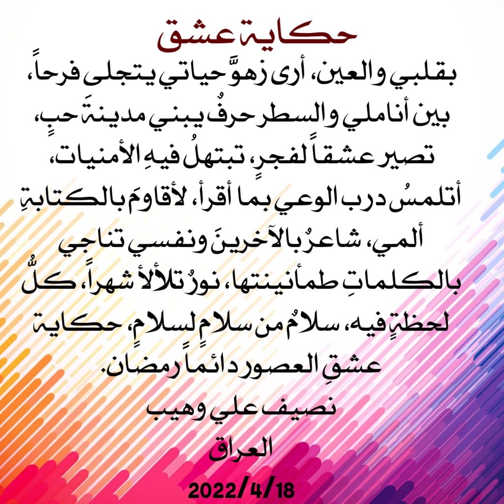 بقلبي والعين، أرى زهوَّ حياتي يتجلى فرحاً، بين أناملي والسطر حرفٌ يبني مدينةَ حبٍ، تصير عشقاً لفجرٍ، تبتهلُ فيهِ الأمنيات، أتلمسُ درب الوعي بما أقرأ، لأقاومَ بالكتابةِ ألمي، شاعرٌ بالآخرينَ ونفسي تناجي بالكلماتِ طمأنينتها، نورٌ تلألأ شهراً، كلُّ لحظةٍ فيه، سلامٌ من سلامٍ لسلامٍ، حكاية عشقِ العصور دائماً رمضان.