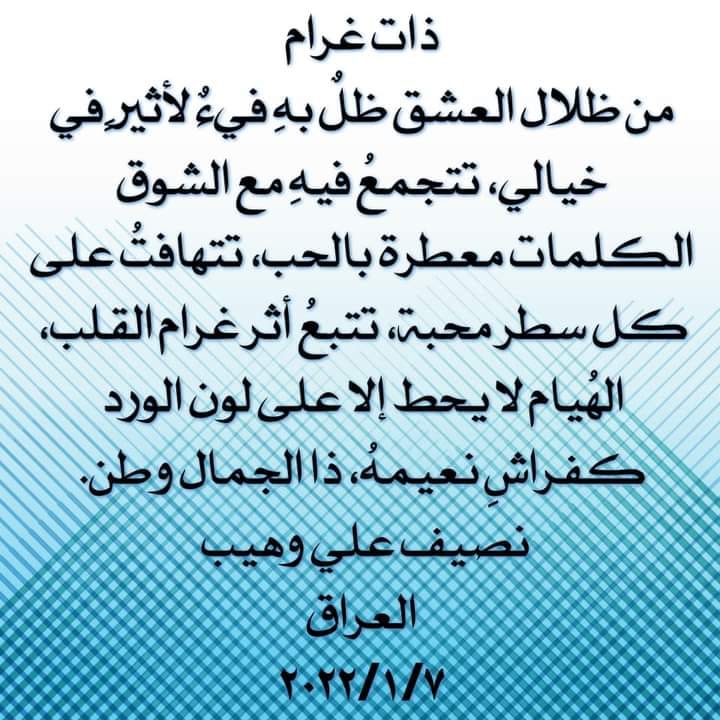 من ظلال العشق ظلٌ بهِ فيءٌ لأثيرٍ في خيالي، تتجمعُ فيهِ مع الشوق الكلمات معطرة بالحب، تتهافتُ على كل سطر محبة، تتبعُ أثر غرام القلب، الهُيام لا يحط إلا على لون الورد كفراشِ نعيمهُ، ذا الجمال وطن.