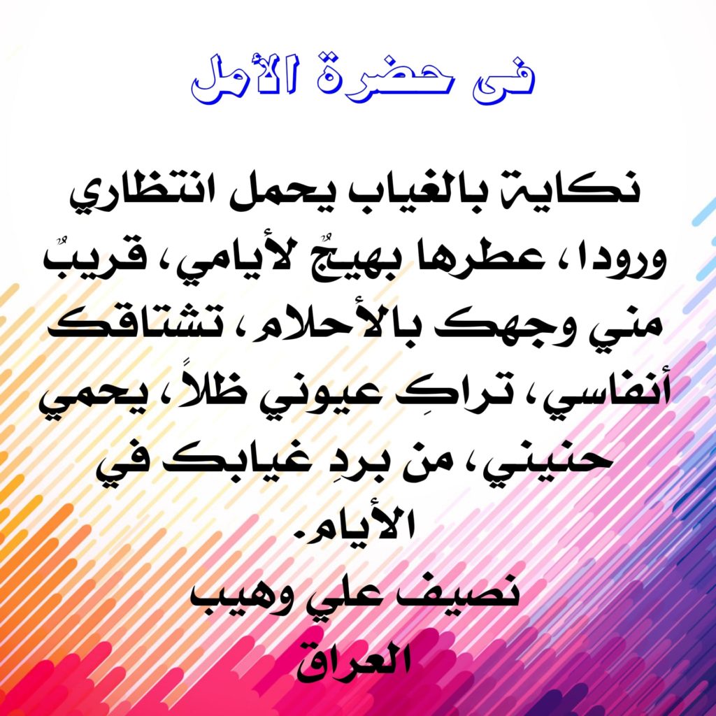 نكاية بالغياب يحمل انتظاري ورودا، عطرها بهيجٌ لأيامي، قريبٌ مني وجهك بالأحلام، تشتاقك أنفاسي، تراكِ عيوني ظلاً، يحمي حنيني، من بردِ غيابك في الأيام.