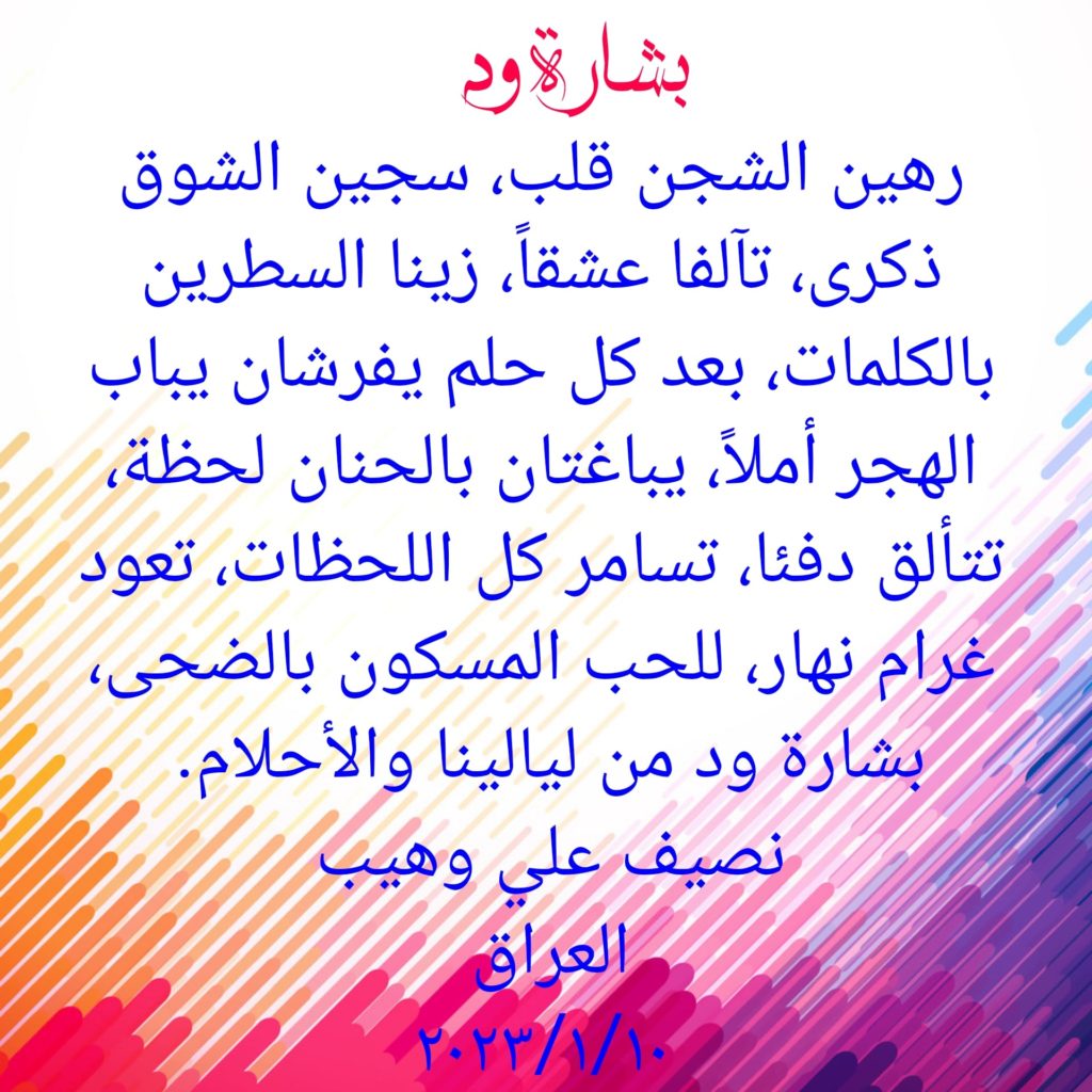 رهين الشجن قلبٌ، سجين الشوق ذكرى، تآلفا عشقاً، زينا السطرين بالكلمات، بعد كل حلم يفرشان يباب الهجر أملاً، يباغتان بالحنان لحظة، تتألق دفئا، تسامر كل اللحظات، تعود غرام نهار، للحب المسكون بالضحى، بشارة ود من ليالينا والأحلام.