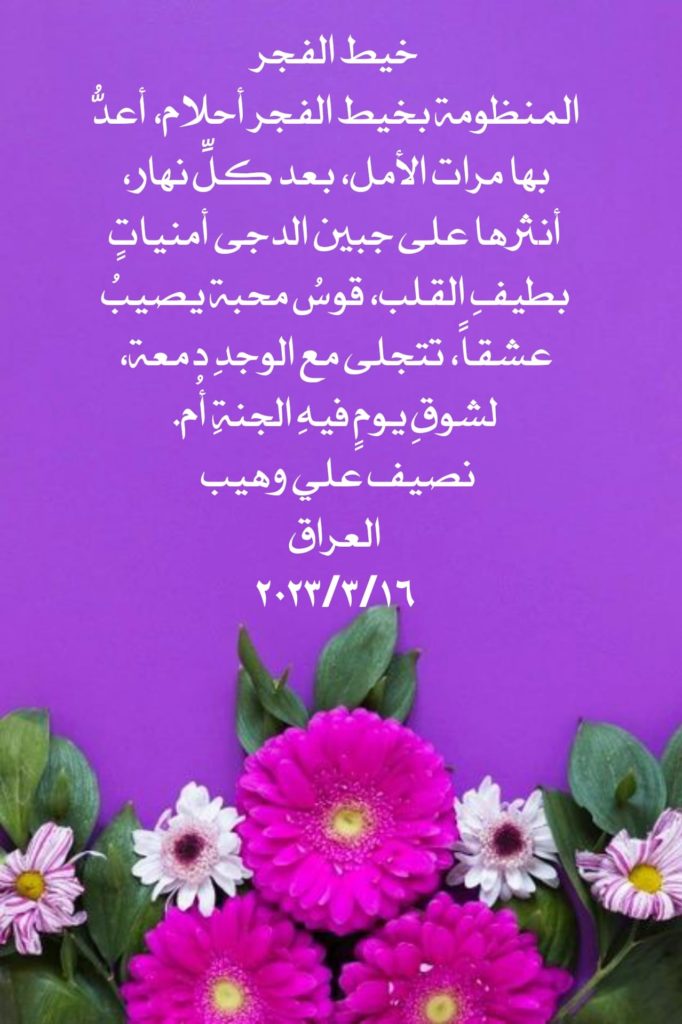 المنظومة بخيط الفجر أحلام، أعدُّ بها مرات الأمل، بعد كلِّ نهار، أنثرها على جبين الدجى أمنياتٍ بطيفِ القلب، قوسُ محبة يصيبُ عشقاً، تتجلى مع الوجدِ دمعة، لشوقِ يومٍ فيهِ الجنةِ أُم.