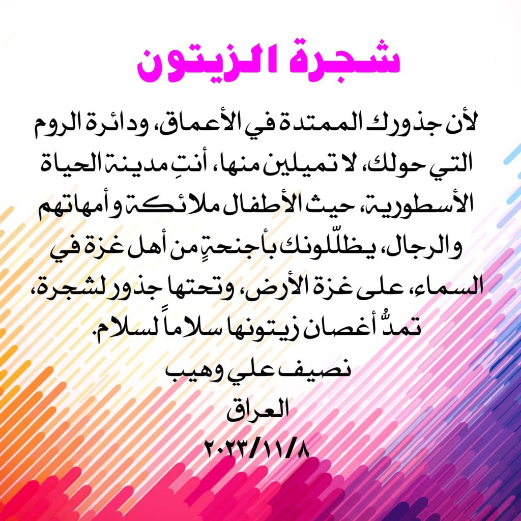 لأن جذورك الممتدة في الأعماق، ودائرة الروم التي حولك، لا تميلين منها، أنتِ مدينة الحياة الأسطورية، حيث الأطفال ملائكة وأمهاتهم والرجال، يظلّلونك بأجنحةٍ من أهل غزة في السماء، على غزة الأرض، وتحتها جذور لشجرة، تمدُّ أغصان زيتونها سلاماً لسلام.