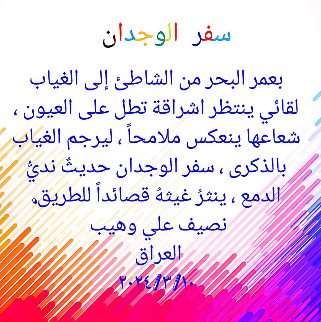 بعمر البحر من الشاطئ إلى الغياب لقائي ينتظر اشراقة تطل على العيون، شعاعها ينعكس ملامحاً، ليرجم الغياب بالذكرى، سفر الوجدان حديثٌ نديُّ الدمع، ينثرُ غيثهُ قصائداً للطريق.