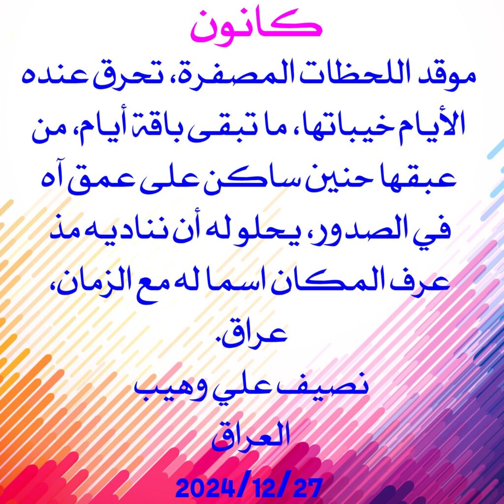 موقد اللحظات المصفرة، تحرق عنده الأيام خيباتها، ما تبقى باقة أيام، من عبقها حنين ساكن على عمق آه في الصدور، يحلو له أن نناديه مذ عرف المكان اسما له مع الزمان، عراق.
