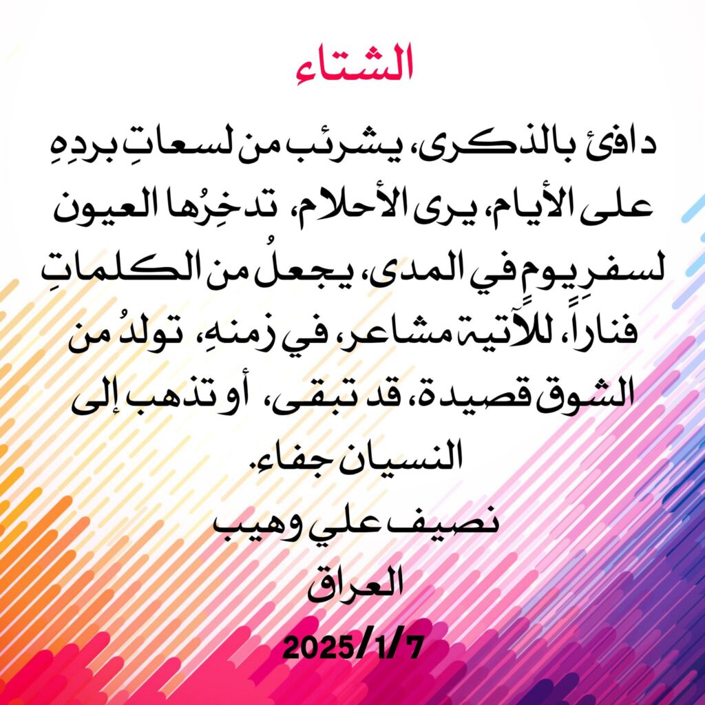 دافئ بالذكرى، يشرئب من لسعاتِ بردِهِ على الأيام، يرى الأحلام، تدخِرُها العيون لسفرِ يومٍ في المدى، يجعلُ من الكلماتِ فناراً، للآتية مشاعر، في زمنهِ، تولدُ من الشوق قصيدة، قد تبقى، أو تذهب إلى النسيان جفاء.