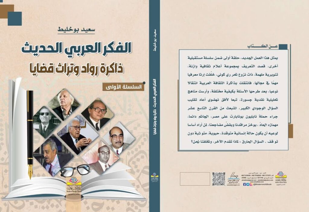 أصدرت دار ”عالم الكتب الحديث للنشر والتوزيع” الأردنية، كتابا جديدا للباحث سعيد بوخليط، تحت عنوان ”الفكر العربي الحديث: ذاكرة روَّاد وتراث قضايا”.