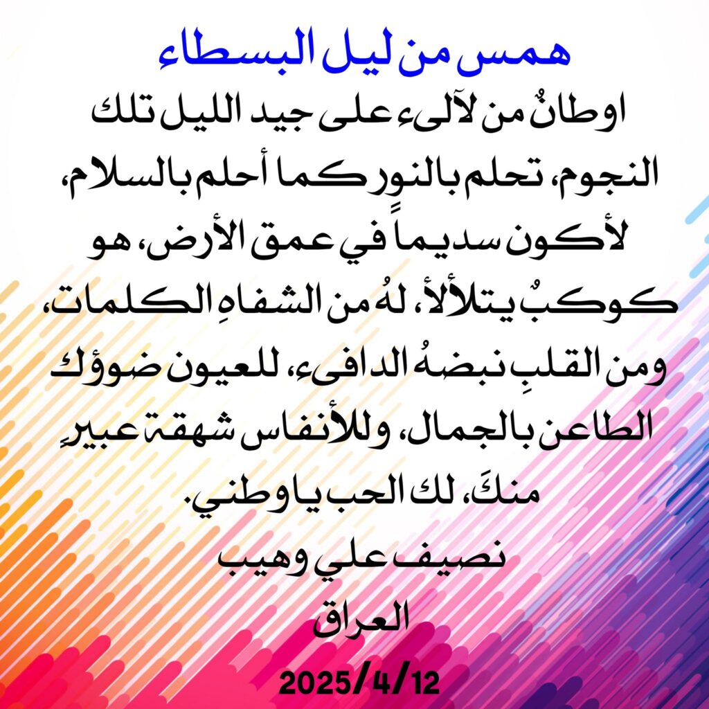 أوطانٌ من لآلئ على جيد الليل تلك النجوم، تحلم بالنور كما أحلم بالسلام، لأكون سديماً في عمق الأرض، هو كوكبٌ يتلألأ، لهُ من الشفاهِ الكلمات، ومن القلبِ نبضهُ الدافئ، للعيون ضوؤك الطاعن بالجمال، وللأنفاس شهقة عبيرٍ منكَ، لك الحب يا وطني.