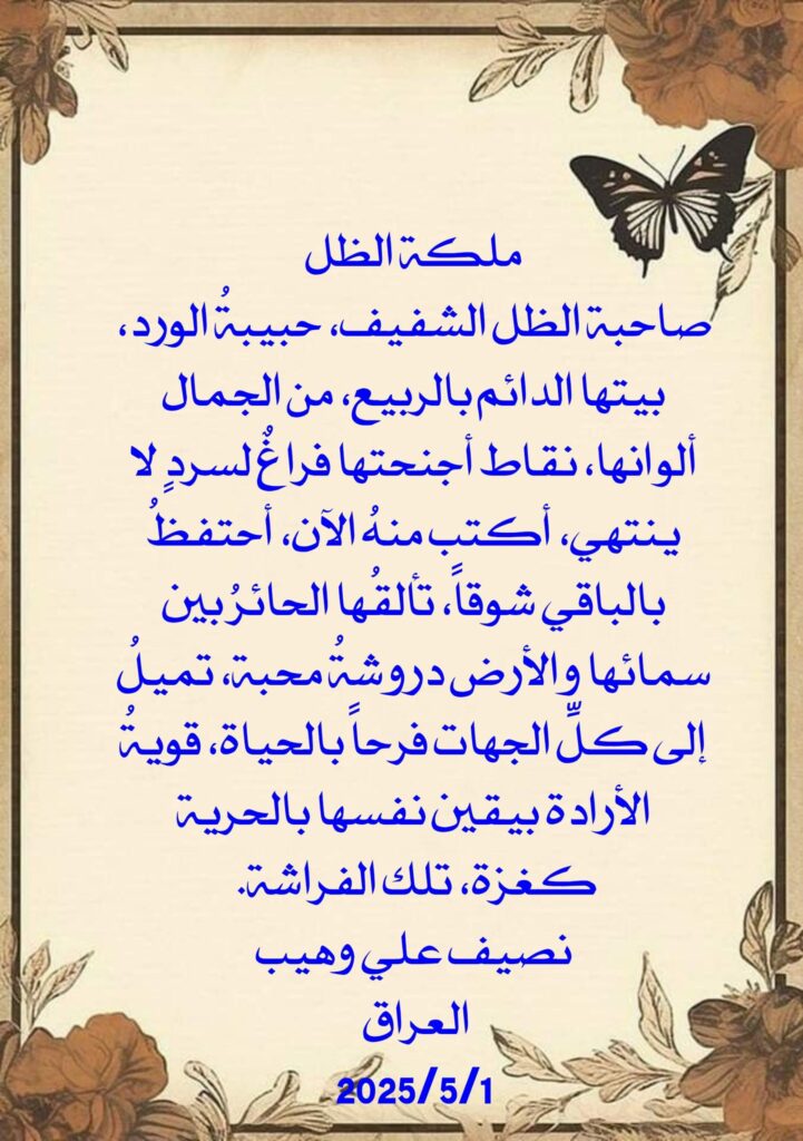 صاحبة الظل الشفيف، حبيبةُ الورد، بيتها الدائم بالربيع، من الجمال ألوانها، نقاط أجنحتها فراغٌ لسردٍ لا ينتهي، أكتب منهُ الآن، أحتفظُ بالباقي شوقاً، تألقُها الحائرُ بين سمائها والأرض دروشةُ محبة، تميلُ إلى كلِّ الجهات فرحاً بالحياة، قويةُ الإرادة بيقين نفسها بالحرية كغزة، تلك الفراشة.