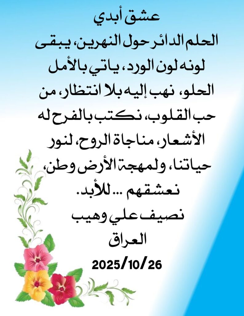 الحلم الدائر حول النهرين، يبقى لونه لون الورد، يأتي بالأمل الحلو، نهب إليه بلا انتظار، من حب القلوب، نكتب بالفرح له الأشعار، مناجاة الروح، لنور حياتنا، ولمهجة الأرض وطن، نعشقهم… للأبد.